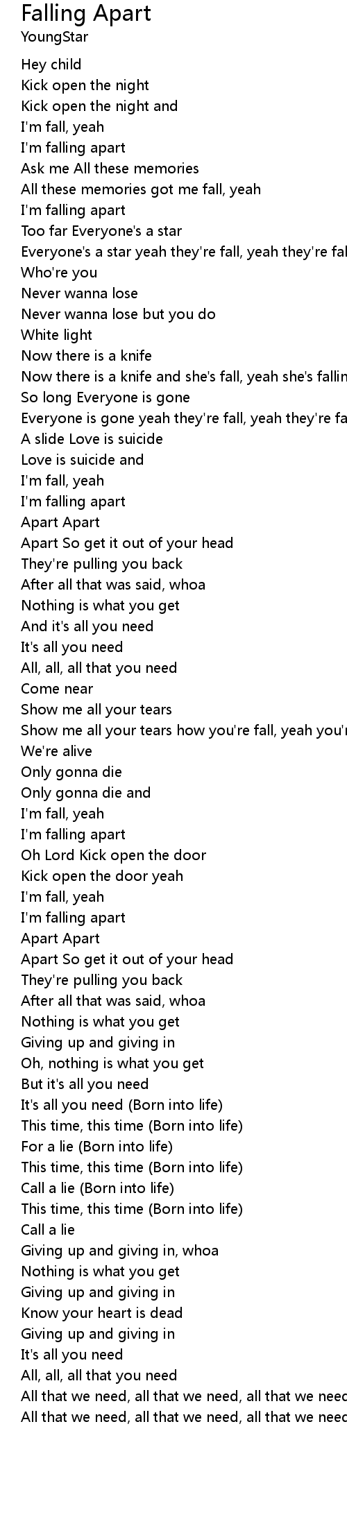 Show me all your tears how you're fall, yeah you're falling apart |