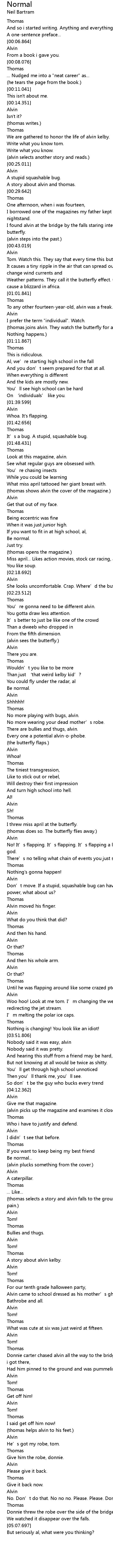 | [01:10.712] | thomas joins alvin. They watch the butterfly for a very long time. Nothing happens. |