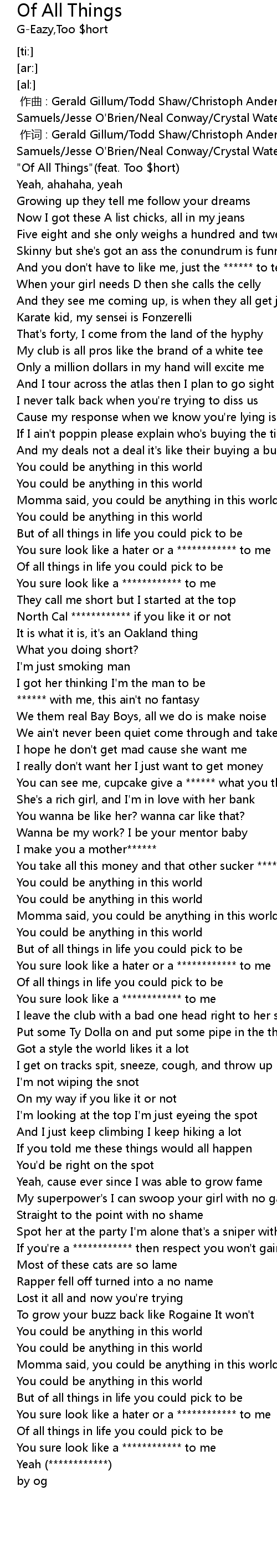 | [00:00.00] | " Of All Things" feat. Too hort |