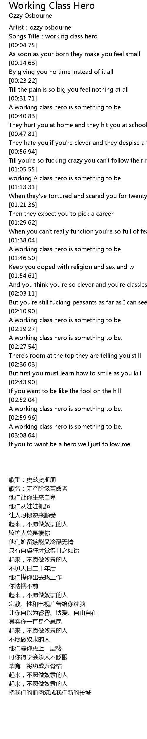| [00:02.67] | Songs Title: working class hero |
