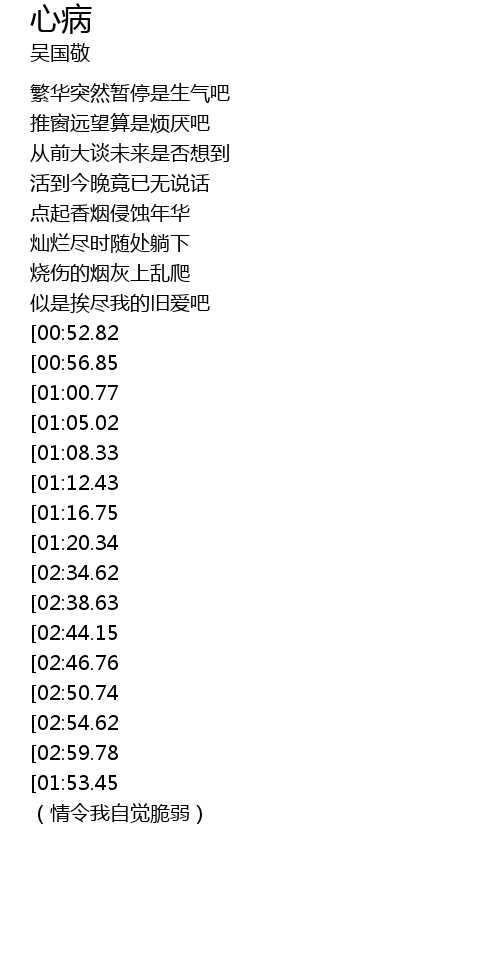 | [03:03.87][01:53.45] | wéi dú nǐ lìng wǒ cuì ruò |