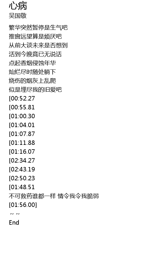 | [02:59.45][01:48.51] | 不可救药谁都一样 唯独你令我脆弱 |