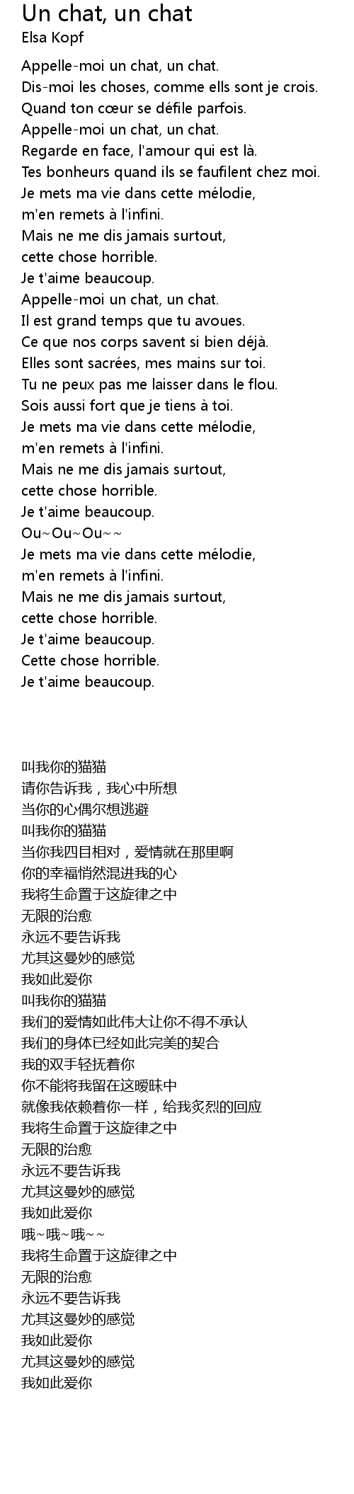 | [00:25.112] | Appelle-moi un chat, un chat. |