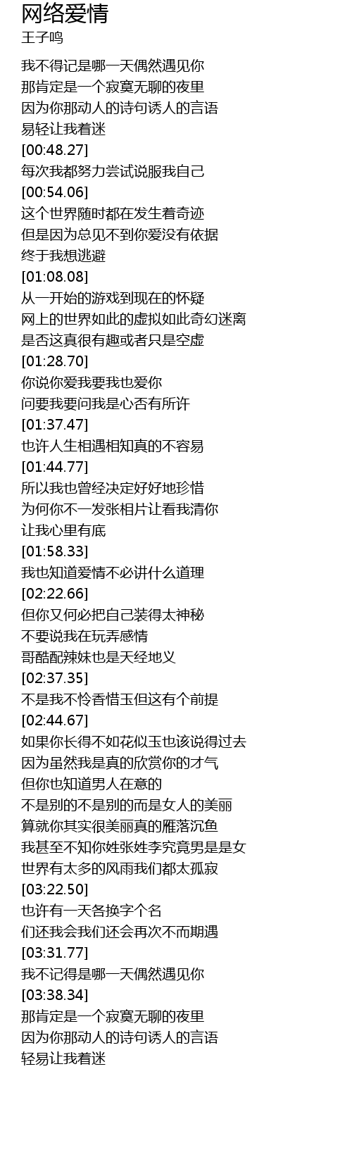 | [01:16.79] | 网上的世界如此的虚拟如此奇幻迷离 |