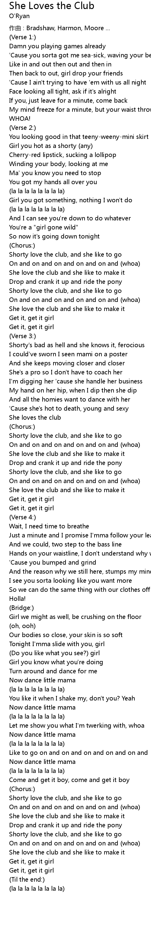 | Shorty love the club, and she like to go | |