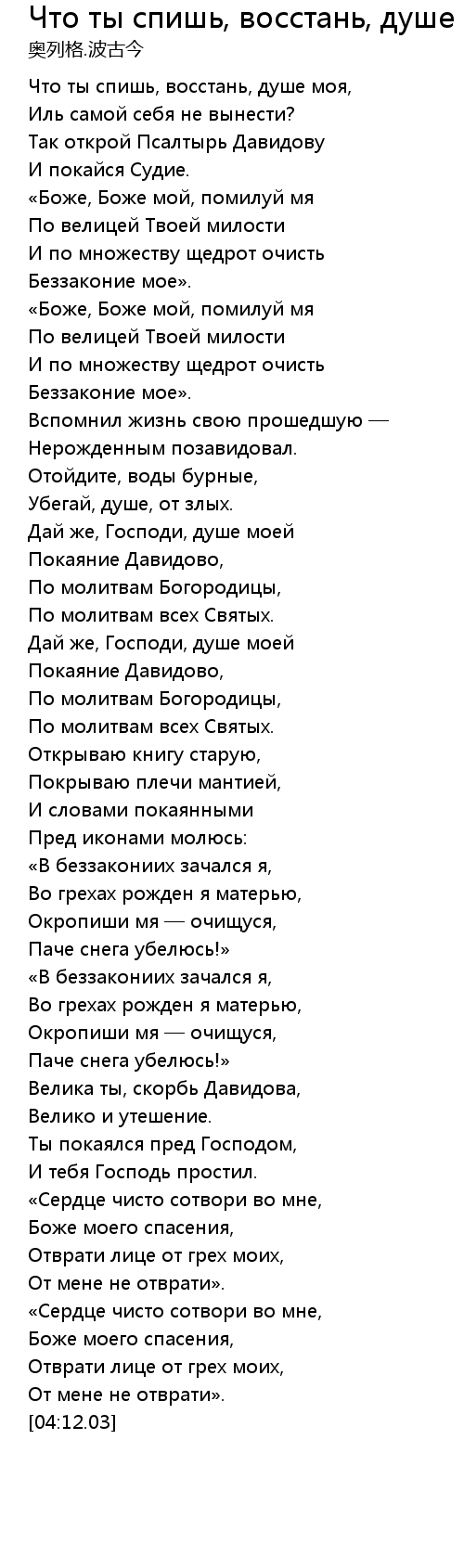 Что ты спишь, восстань, душе моя 歌词