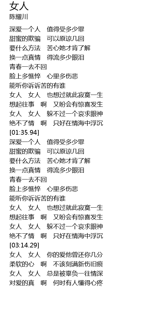 | [03:41.45] | 女人 女人 总是被辜负一往情深 |