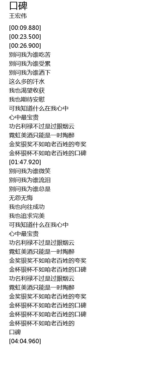 | [01:37.630] | 金杯银杯不如咱老百姓的口碑 |