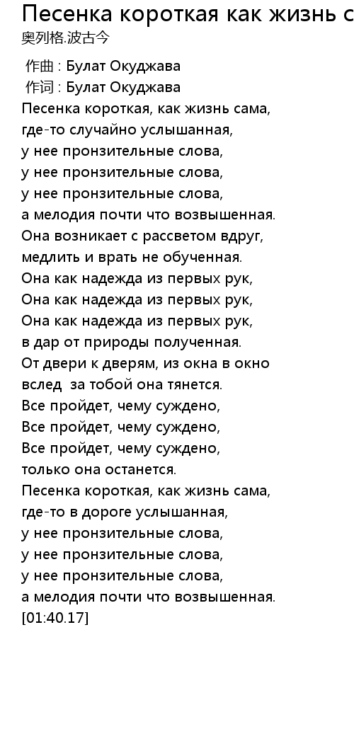 Песенка короткая как жизнь сама 歌词