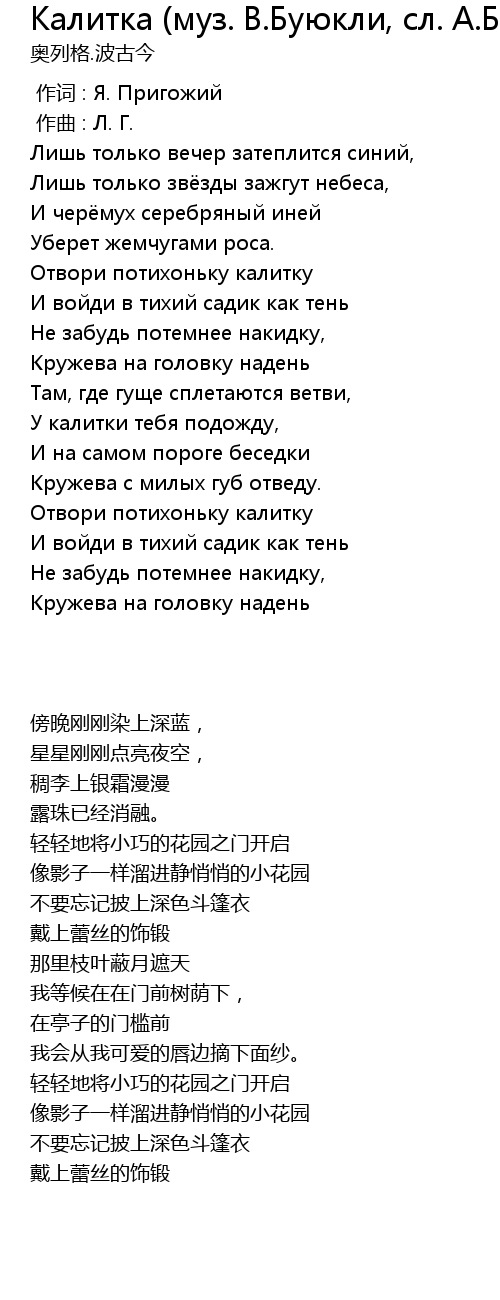 | 歌曲 | Калитка (муз. В.Буюкли, сл. А.Будищева) |
