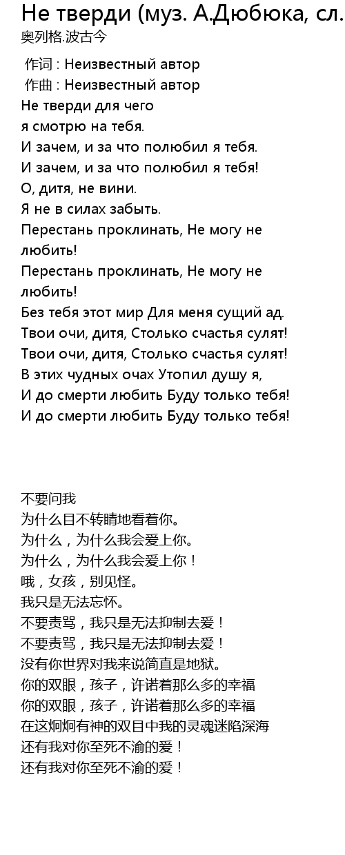 | 歌曲 | Не тверди (муз. А.Дюбюка, сл. П.Муратова) |