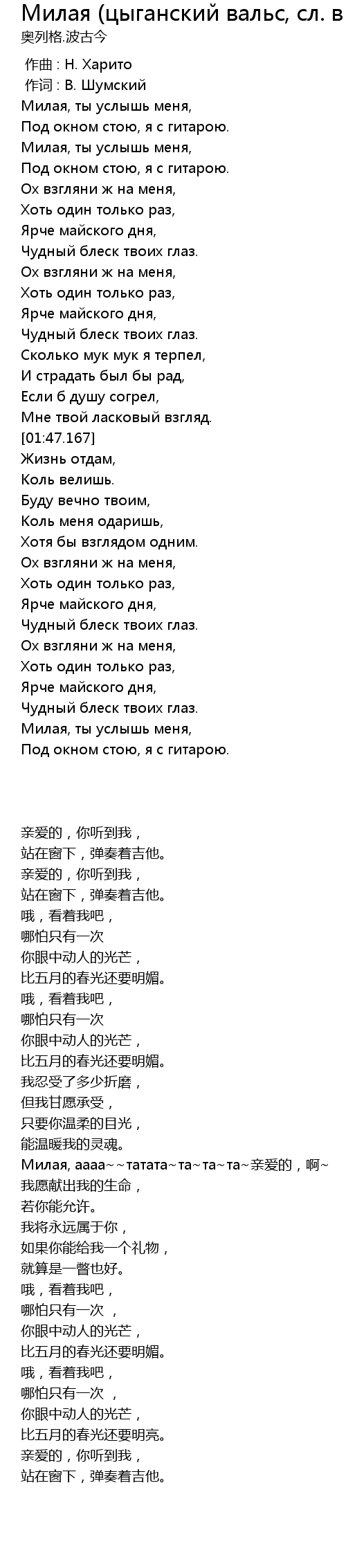 | [01:47.167] | Милая, аааа~~татата~та~та~та~亲爱的,啊~ |