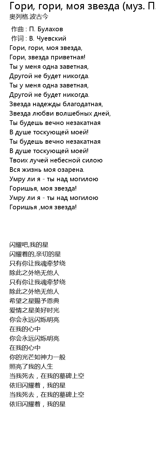| 歌曲 | Гори, гори, моя звезда (муз. П.Булахова, сл. В.Чуевского) |