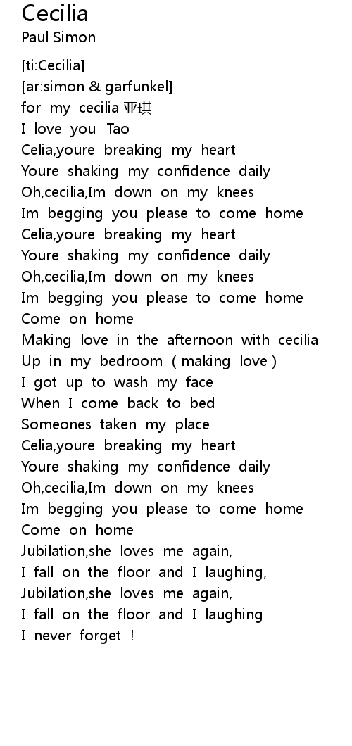 | [00:18.818] | Oh, cecilia, Im down on my knees |