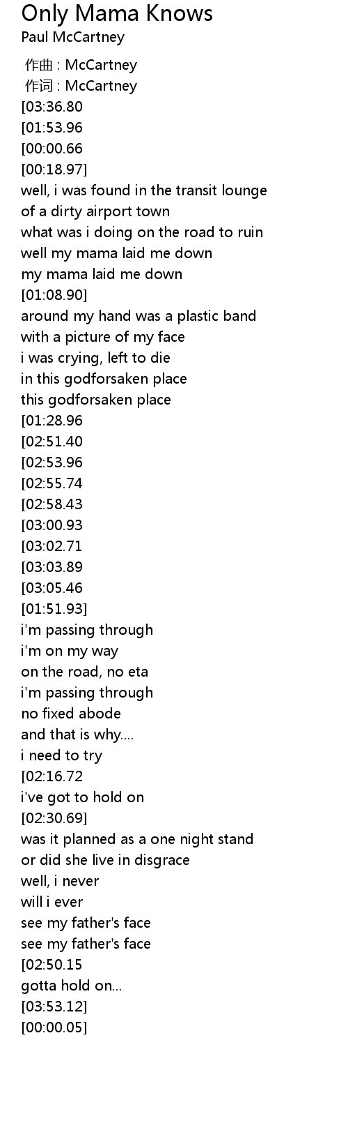 | [04:01.40][01:53.96][00:00.87] | paul mccartneyronly mama knows |