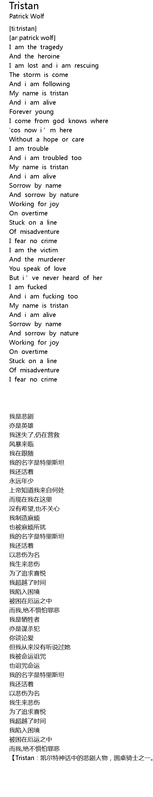 | [01:36.96] | 而我,绝不惧怕罪恶 【Tristan:凯尔特神话中的悲剧人物,圆桌骑士之一。出生时母亲难产而死,死前给他取名Tristan(有“悲伤”的含义)。与Iseult有一段著名的悲剧恋情。】 |