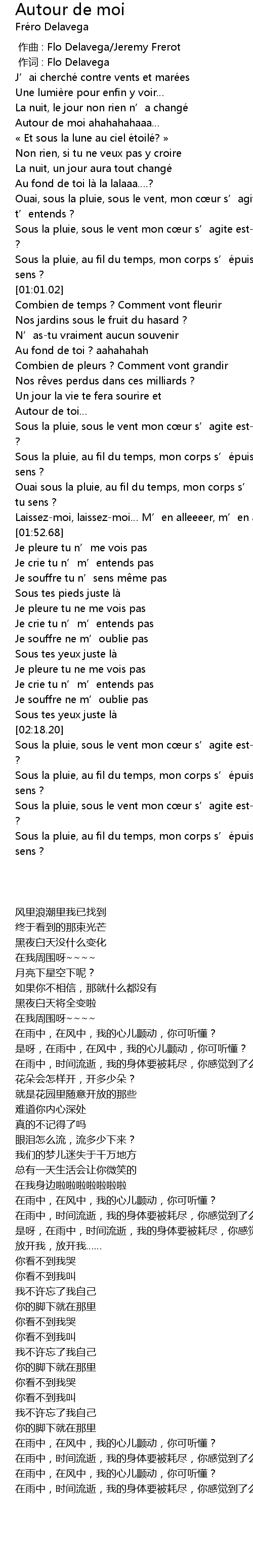 | [01:39.82] | Ouai sous la pluie, au fil du temps, mon corps s'é puise estce que tu sens ? |