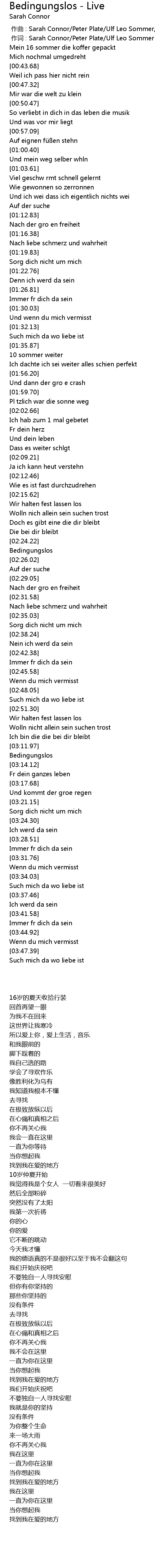 | [00:01.00] | 作词 : Sarah Connor/Peter Plate/Ulf Leo Sommer |