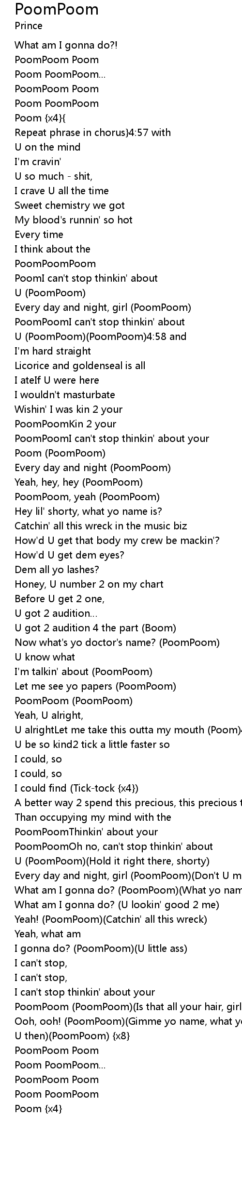 | Ooh, ooh! (PoomPoom)(Gimme yo name, what yo name is?) (PoomPoom)(Well then fuck U then)(PoomPoom) {x8} | |