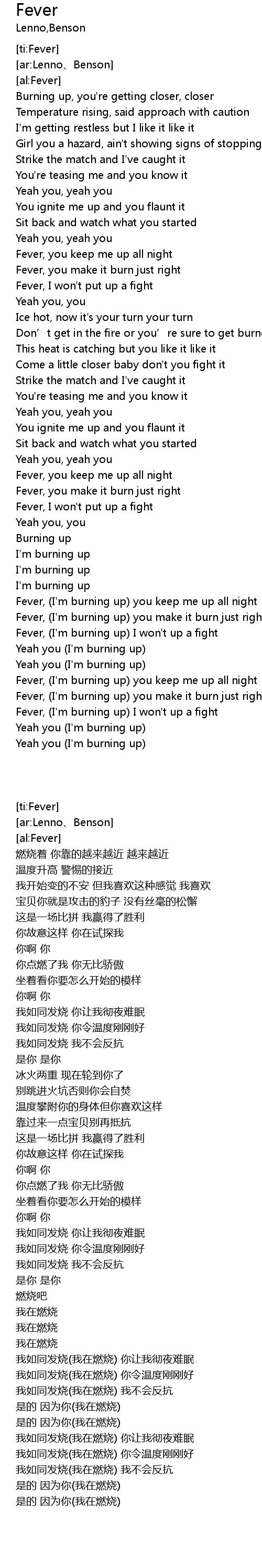 | [02:22.61] | Fever, (I'm burning up) you keep me up all night |
