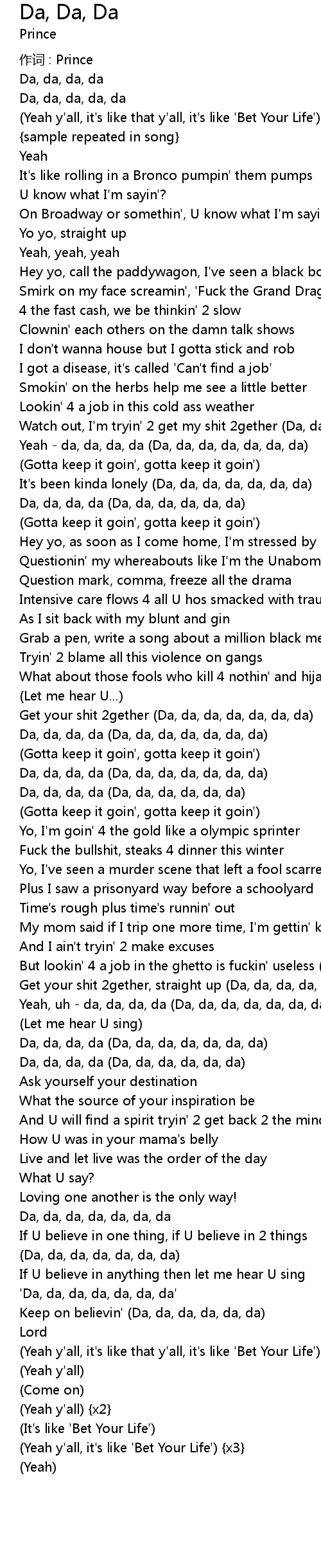 | Yeah, uh da, da, da, da Da, da, da, da, da, da, da | |