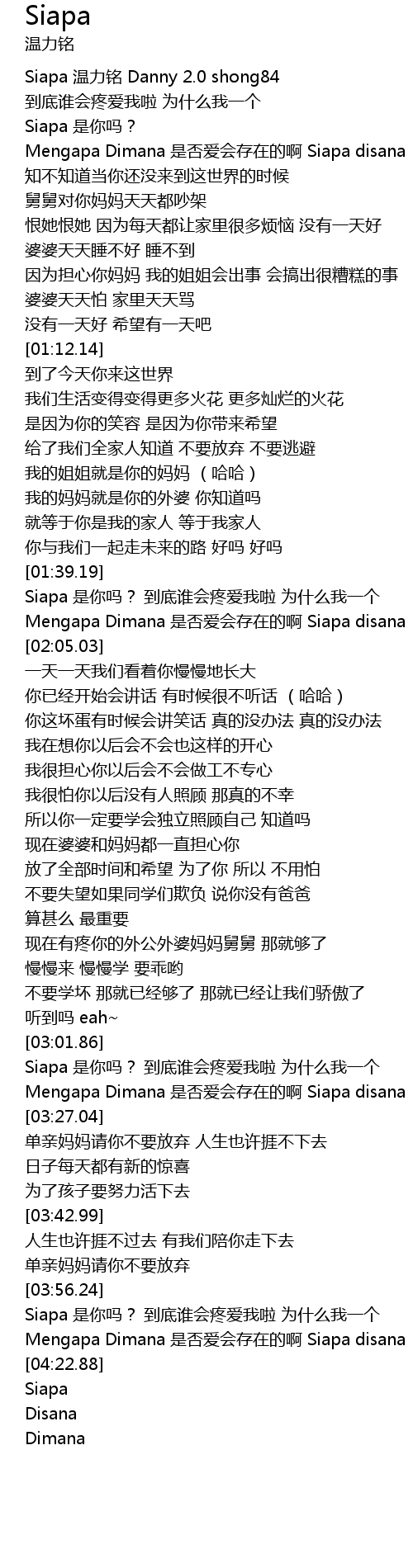| [01:39.72] | Siapa shi ni ma? dao di shui hui teng ai wo la wei shi me wo yi ge |