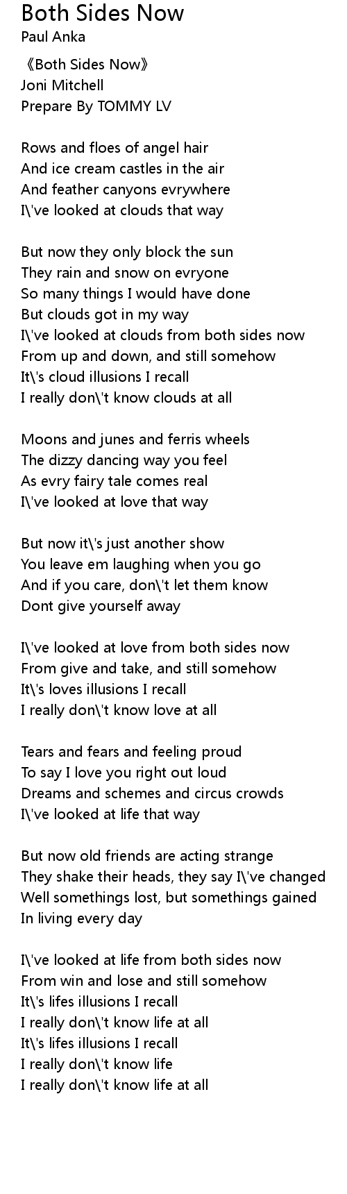 | I\'ve looked at life from both sides now | |