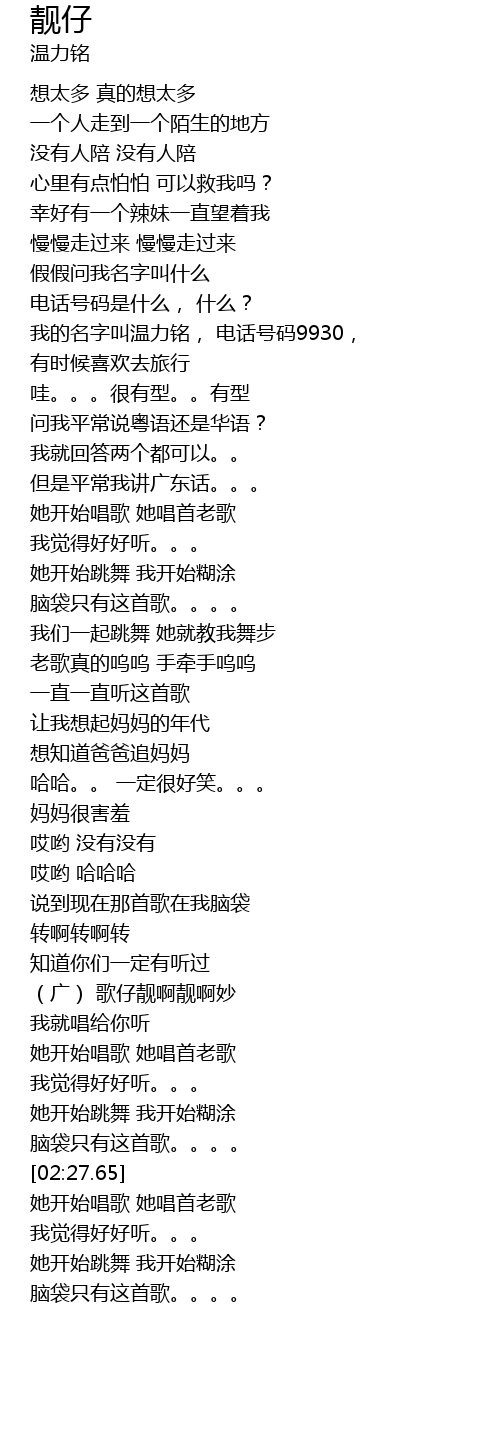 | [00:42.54] | 我的名字叫温力铭, 电话号码9930, |