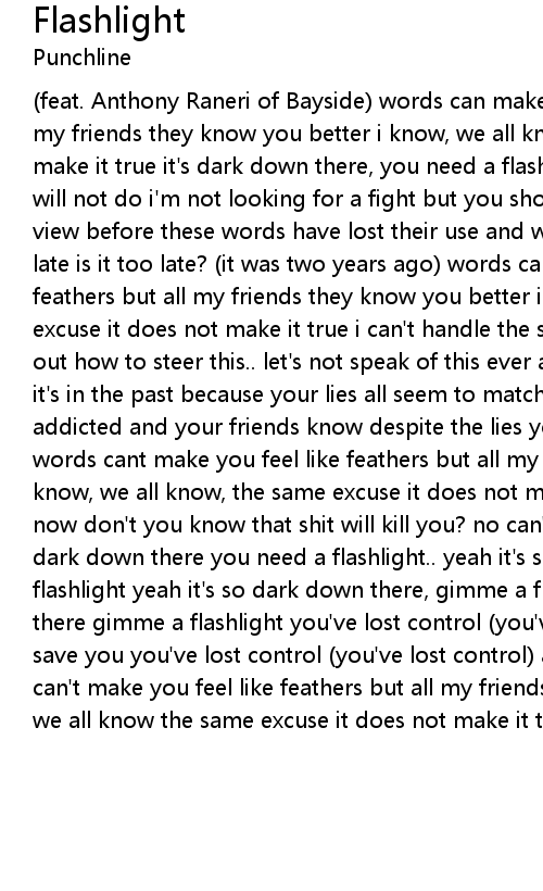 (feat. Anthony Raneri of Bayside) words can make you feel like feathers but all my friends they know you better i know, we all know, the same excuse it does not make it true it's dark down there, you need a flashlight- your artificial light will not do i'm not looking for a fight but you should see a different point of view before these words have lost their use and we are talking like it's too late is it too late? (it was two years ago) words can make you feel like feathers but all my friends they know you better i know, we all know, the same excuse it does not make it true i can't handle the situation if i can't figure out how to steer this.. let's not speak of this ever again and ever again as if it's in the past because your lies all seem to match but the truth is you're addicted and your friends know despite the lies you swear to god they are true words cant make you feel like feathers but all my friends they know you better i know, we all know, the same excuse it does not make it true don't talk about it now don't you know that shit will kill you? no can't talk about it now whoa it's dark down there you need a flashlight.. yeah it's so dark down there, you need a flashlight yeah it's so dark down there, gimme a flashlight it's so dark down there gimme a flashlight you've lost control (you've lost control) and we won't save you you've lost control (you've lost control) and we won't save you words can't make you feel like feathers but all my friends we know you better i know we all know the same excuse it does not make it true. |