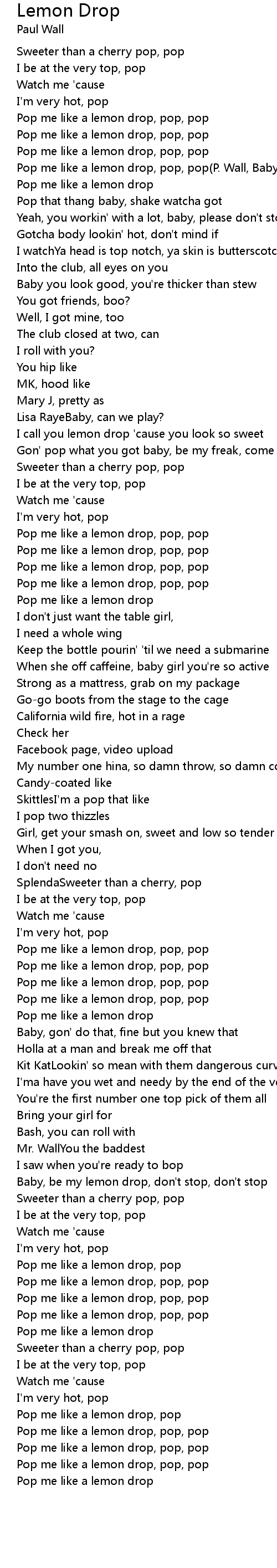| Pop me like a lemon drop, pop, pop(P. Wall, Baby Bash) | |