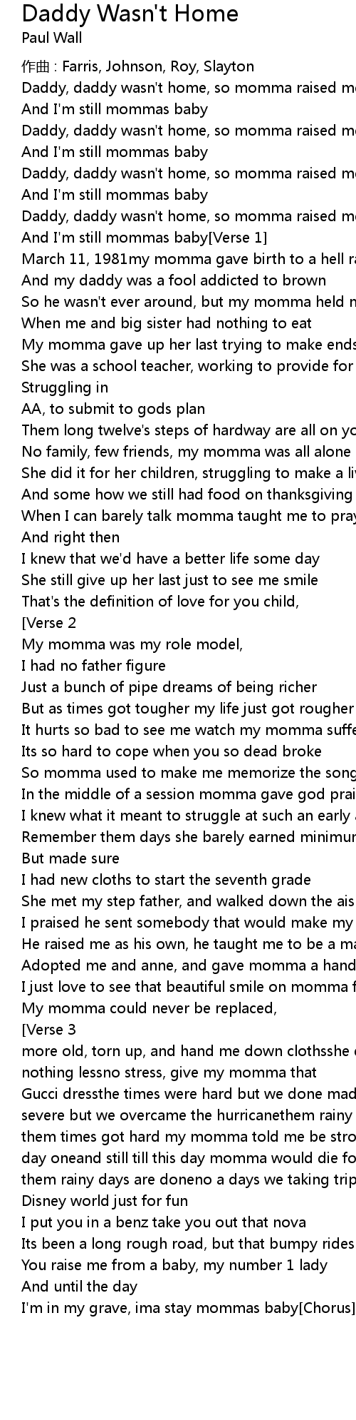 | Chorus Daddy, daddy wasn' t home, so momma raised me | |