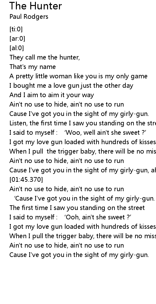 | [01:36.350] | Cause I' ve got you in the sight of my girlygun, ah. |