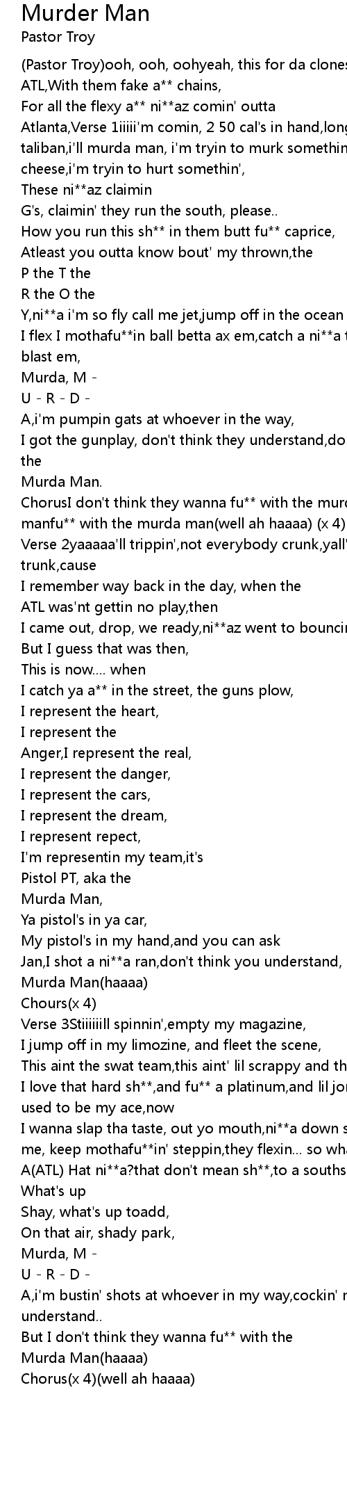 ChorusI don't think they wanna fu** with the murda man, fu** with the murda manfu** with the murda man(well ah haaaa) (x 4) |