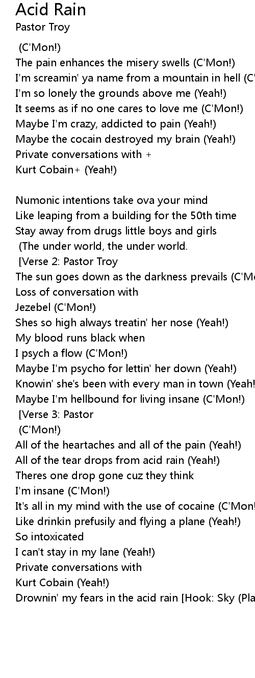 I'm drowning my pain in the acid rain (C'Mon!) [Hook: Sky] [Verse 3: Pastor Troy] (C'Mon!)