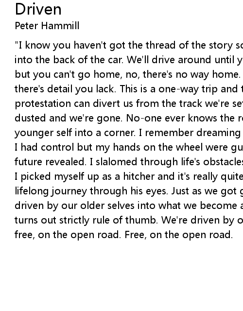 "I know you haven't got the thread of the story so far. Just throw your luggage into the back of the car. We'll drive around until you think I've gone too far but you can't go home, no, there's no way home. You haven't lost the plot but there's detail you lack. This is a one-way trip and there's no turning back. No protestation can divert us from the track we're set upon. Soon it's done and dusted and we're gone. No-one ever knows the road they're on." I'm driven by my younger self into a corner. I remember dreaming the open road. I liked to think I had control but my hands on the wheel were guided by some outside force as my future revealed. I slalomed through life's obstacles more on instinct than feel. I picked myself up as a hitcher and it's really quite a deal to see this lifelong journey through his eyes. Just as we got going we've arrived. We're driven by our older selves into what we become and all our careful planning turns out strictly rule of thumb. We're driven by ourselves but dream we're free, on the open road. Free, on the open road.