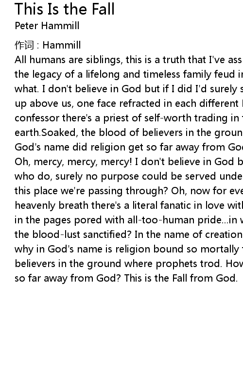 | All humans are siblings, this is a truth that I' ve assumed all fighting over the legacy of a lifelong and timeless family feud in the name of I don' t know what. I don' t believe in God but if I did I' d surely say there is only one Power up above us, one face refracted in each different Faith. But for every holy confessor there' s a priest of selfworth trading in the eternal for power on earth. Soaked, the blood of believers in the ground where prophets trod. How in God' s name did religion get so far away from God? Oh, mercy, mercy, mercy now! Oh, mercy, mercy, mercy! I don' t believe in God but, with all respect to those who do, surely no purpose could be served under heaven if there' s no mercy in this place we' re passing through? Oh, now for every sainted ascetic drawing heavenly breath there' s a literal fanatic in love with death. Soaked, the blood in the pages pored with alltoohuman pride... in what book of what religion is the bloodlust sanctified? In the name of creation, for whatever that is worth, why in God' s name is religion bound so mortally to earth? Soaked, the blood of believers in the ground where prophets trod. How in God' s name did religion fall so far away from God? This is the Fall from God. |