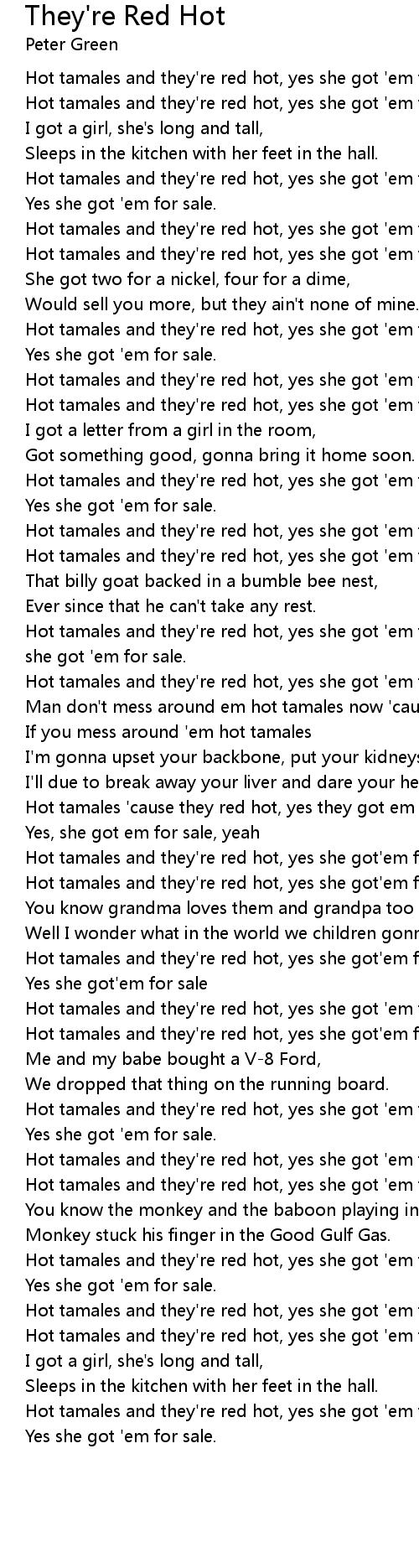 Hot tamales and they're red hot, yes she got 'em for sale, I mean. Yes she got 'em for sale. |