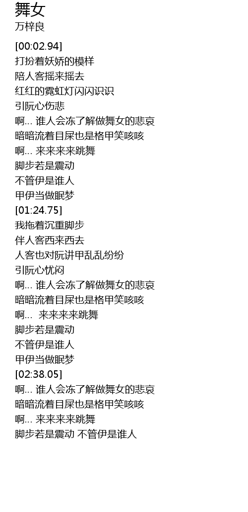 | [03:04.62] | 啊… 谁人会冻了解做舞女的悲哀 |