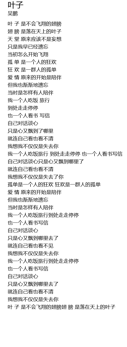 | [04:58.63] | 叶 子 是不会飞翔的翅膀翅 膀 是落在天上的叶子 |