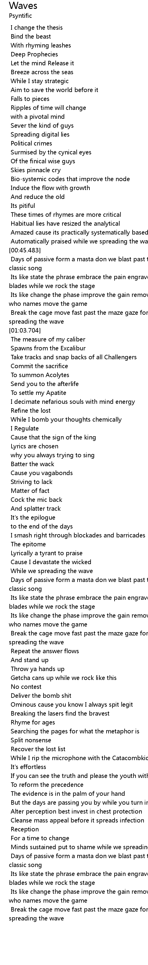 | [02:44.464] | Break the cage move fast past the maze gaze for days in praise we spreading the wave |