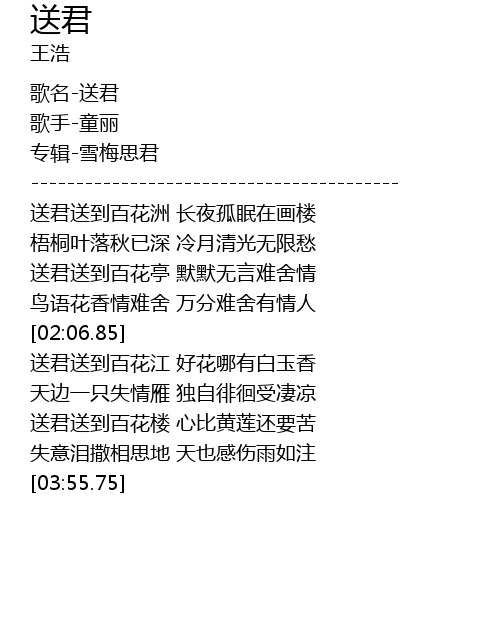 | [02:41.48] | sòng jūn sòng dào bǎi huā jiāng hǎo huā nǎ yǒu bái yù xiāng |