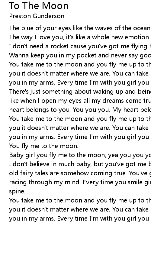 You take me to the moon and you fly me up to the stars. Girl as long as I'm with you it doesn't matter where we are. You can take me to the moon and I'll hold you in my arms. Every time I'm with you girl you take me to the moooooon. |