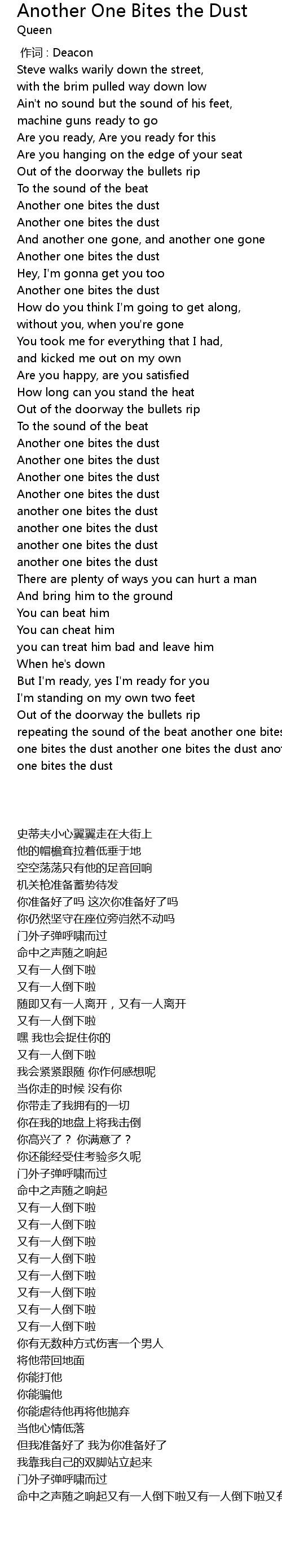| [02:53.760] | repeating the sound of the beat another one bites the dust another one bites the dust another one bites the dust another one bites the dust another one bites the dust |