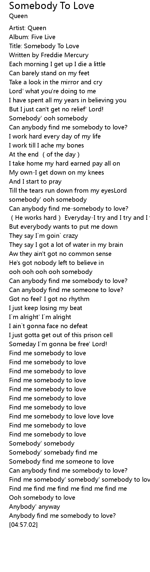 | [04:10.56] | Find me somebody' somebody' somebody to love |