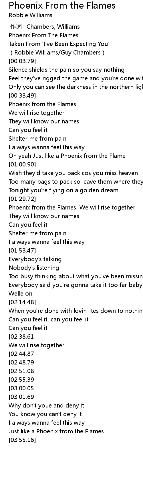 | [00:56.39] | Oh yeah Just like a Phoenix from the Flame |