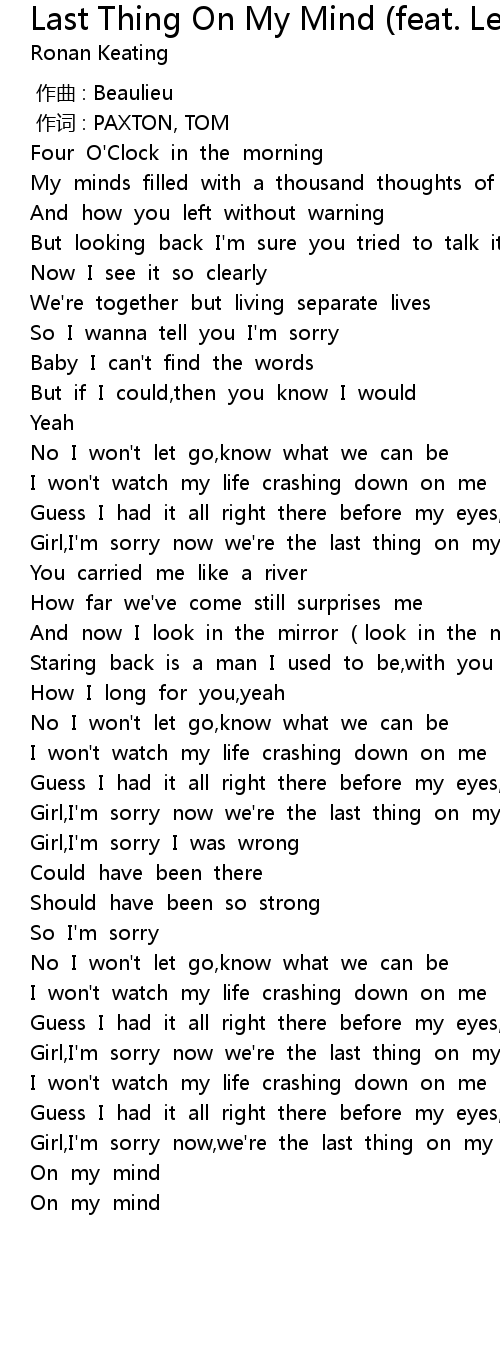 | [02:18.21] | Girl, I' m sorry now we' re the last thing on my mind |