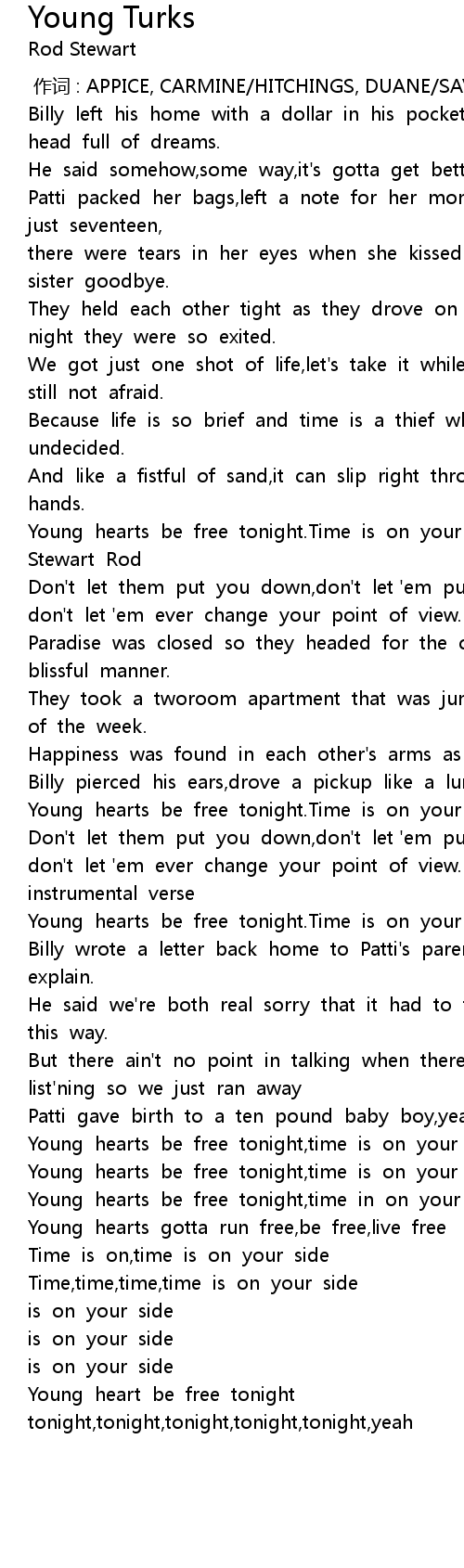 | [03:05.765] | Young hearts be free tonight. Time is on your side. |