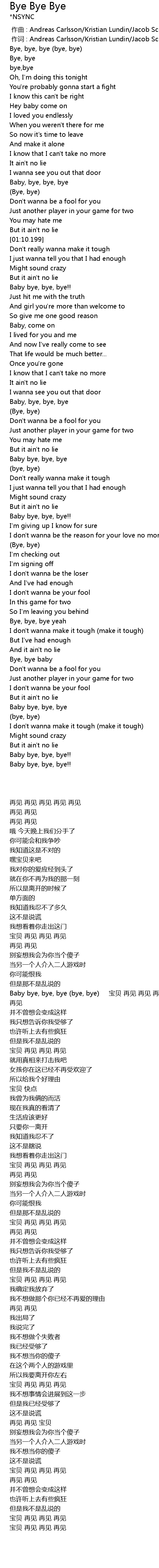 | [01:10.199] | Baby bye, bye, bye (bye, bye) 宝贝 再见 再见 再见 再见 再见 |