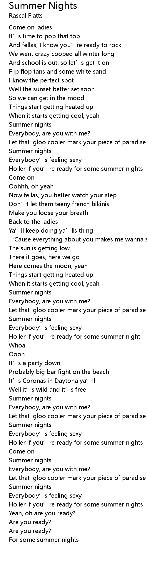 | [03:09.400] | Holler if you' re ready for some summer nights |
