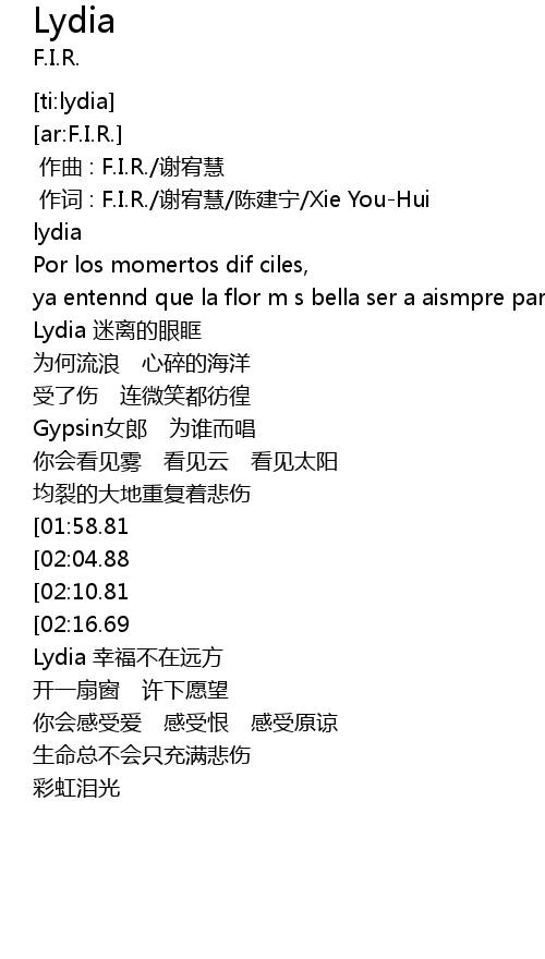 | [00:18.59] | Lydia 迷离的眼眶 |